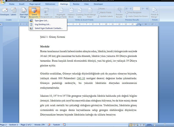 Outlook adres defteri ile Adres ve Mektup Birlestirmek
